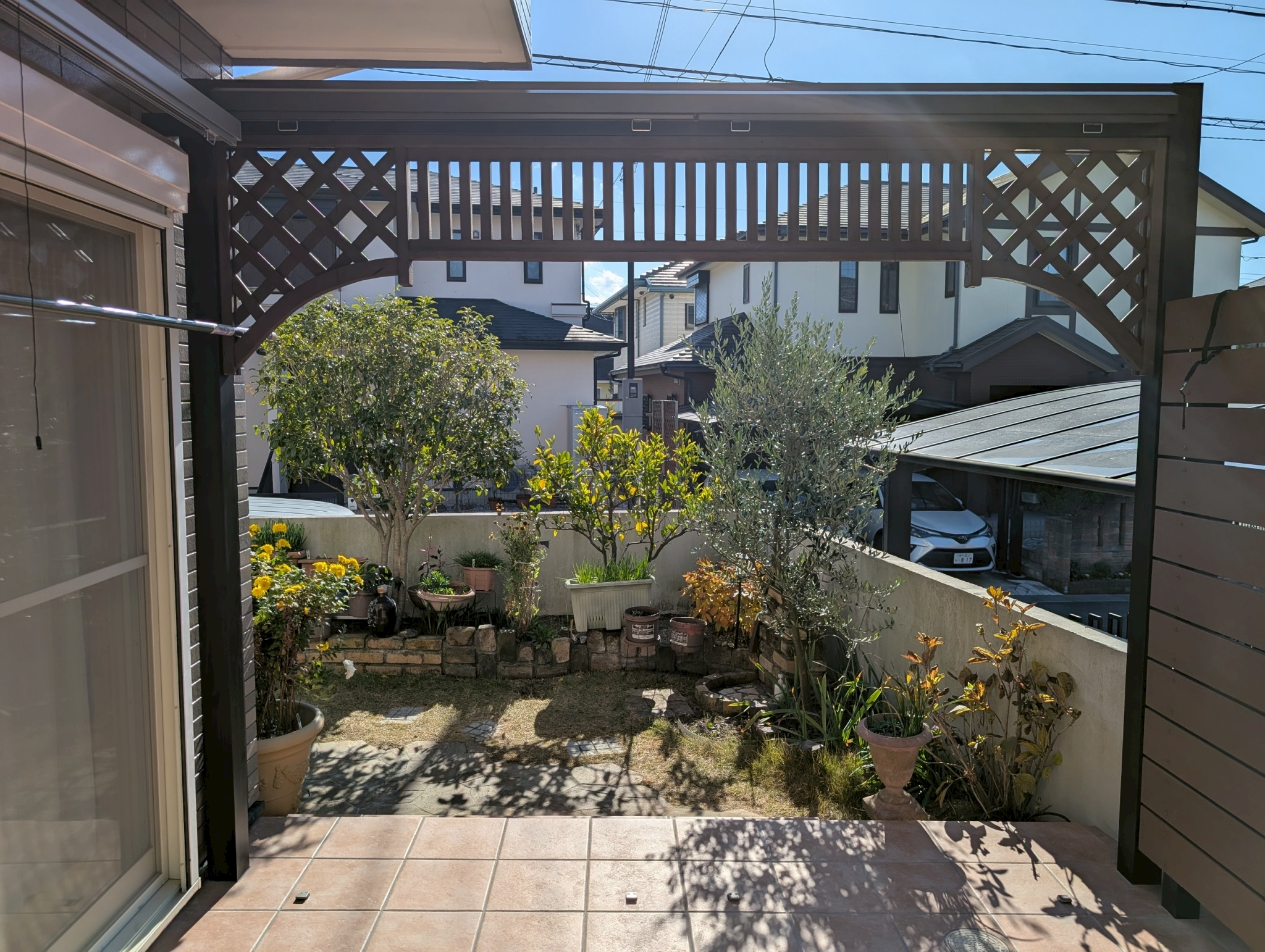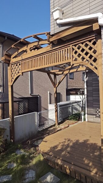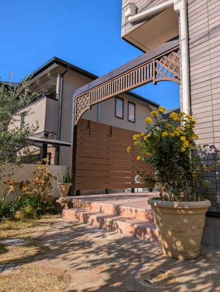 古くなっていたウッドデッキやパーゴラを取り壊し、正面の特徴的なデザインのフェンスは補修して新しいフレームへ取り付けました。