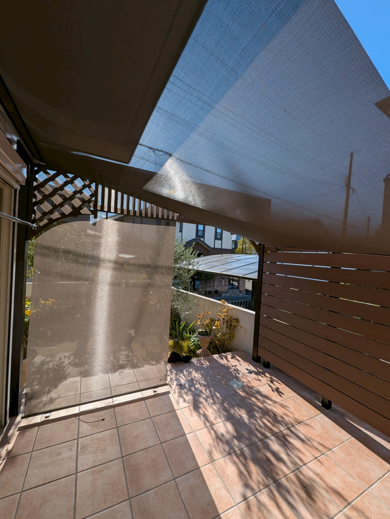 お隣側には目隠しフェンス(エコモックフェンス)を設置し、デッキまわりにはスタイルシェードを取り付けました。